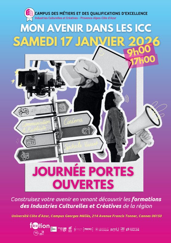 Le Campus des Métiers et des Qualifications d’Excellence Industries Culturelles et Créatives Provence-Alpes-Côte d’Azur organise une journée portes ouvertes dédiée aux formations des Industries Culturelles et Créatives (ICC) présentes sur le territoire régional. Cette journée a pour objectif d’informer et de sensibiliser le public aux différentes formations ICC, avec un focus particulier sur les parcours accessibles sur le bassin cannois. Informations pratiques Cette journée portes ouvertes s’adresse à toute personne souhaitant s’orienter, se réorienter ou se renseigner sur les métiers (…)