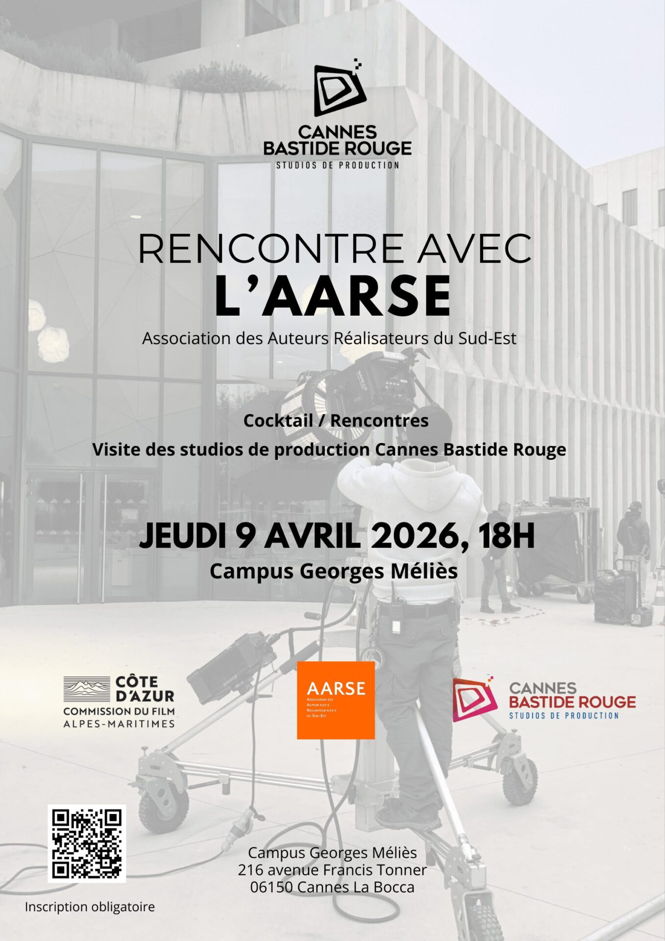 Cannes Bastide Rouge a le plaisir de vous convier à une rencontre avec l’Association des Auteurs Réalisateurs du Sud-Est, jeudi 9 avril 2026 à 18h. Au programme : • Cocktail & rencontres avec l’AARSE • Visite des studios de production Cannes Bastide Rouge Cet événement est organisé avec le soutien de la Commission du Film 06. Un moment convivial pour développer votre réseau et découvrir les studios Cannes Bastide Rouge. Inscription obligatoire : https://forms.gle/peEaPwzR8qE2nnAf8